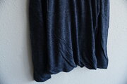 素材はリネン100%。リネンといっても、ニット組織ですので、身体をふんわり包み込むような軽さと柔らかさが新しい感覚です。シャリシャリのざっくり編みのニットではなく、細番手の糸を編み上げた柔らかさが気持ちよいです。二重仕立てですので、透けにくく、ふんわりと包み込まれるような着心地。