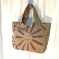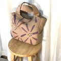 麻100%生地に、花をモチーフにした、幾何学模様をデザインして、手描き染めしました。