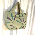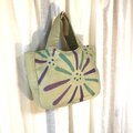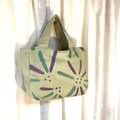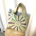 麻100%生地に、花をモチーフにした、幾何学模様をデザインして、手描き染めしました。