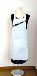 この「水玉ドロップ・リフレッシュエプロン」は、淡い水色の生地に愛らしい水玉の縁取りが施された、爽やかで清潔感あふれるデザインが特徴的です。生地には少し撥水加工が施されており、水回りでの作業も安心。