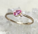 可愛らしいピンク寄りのパパラチアカラーが指元を華やかに彩るスリランカ産サファイアのK10リングです*小粒ではありますが透明度が高くネオン感がありとても煌めきの良いペアシェイプルースを斜めにセット。雫や水滴をイメージして脇にさりげなく煌めく小さなダイヤモンドを添えました*量産品には無い独特なアンティーク調の仕上げ、8~18号(推奨サイズ)の範囲を目安に調整可能、サイズ確定後にマットな覆輪で石留め致します*