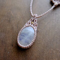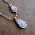 淡く乳白色の中に、見る角度によって月のようなしっとりと輝くブルーシラーが現れるスリランカ産ムーンストーンと、首紐部分にもブルーシラーが力強く煌めくムーンストーンあわせた1点ものマクラメ編みペンダントです。