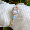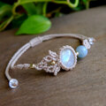 見る角度や光の加減で、石全体に青白く艶やかに煌めくブルーシラーが美しいスリランカ産のムーンストーンをメインに、サイドには、美しい海をイメージさせるブルーカラーが美しいアクアマリンを合わせたアシンメトリデザインのマクラメ編みブレスレットです。