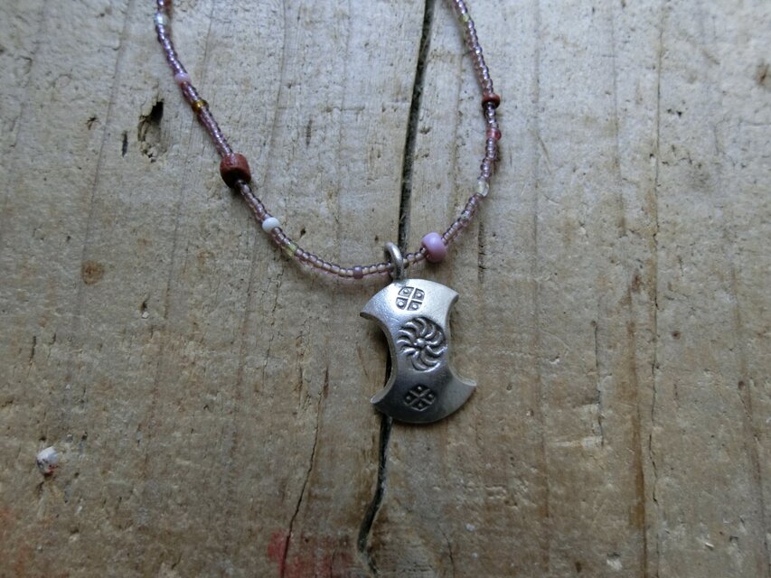 トップはタイのカレン族のシルバーチャーム(分銅型に太陽と田んぼの刻印)