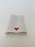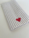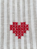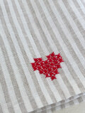 キャメルストライプのリネン生地に赤い刺繍糸で