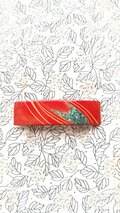 朱漆のバレッタに大胆に渦蒔きを描きました。渦にはたくさんのメキシコアワビ貝を貼り斬新なデザインにしてみました。見る貝は角度によって色が変化するので、セーターやブラウスの胸元を華やかにしてくれます。