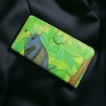 グリーンの葉が重なりあう背景に、繊細なペン画で描かれたルリちゃん。