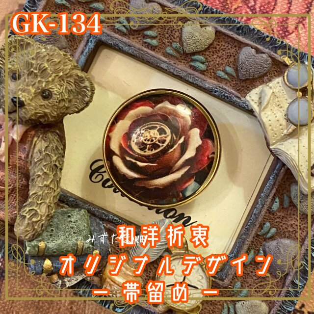 着物リメイク ガラス帯留め 和洋折衷 和ロリータ ハンドメイド アクセサリー 歯車が咲いた、帯元の機械仕掛けの薔薇 GK-134