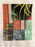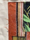 既成の生成りのトートにヴィンテージの様々なファブリックを組み合わせ塗料を吹き付けたアブストラクトなトートバッグ。