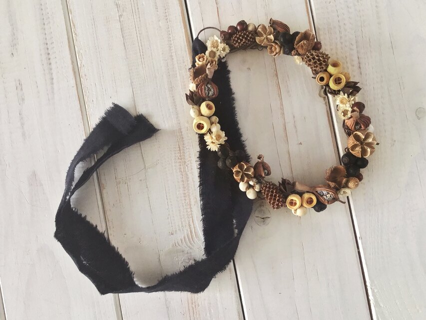 月桃の実やパクリ、アンバーナッツ、バラの実など様々な実をアレンジしたオーバル形のミニリース。