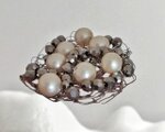 パールとシルバーカラーのグラスビーズをワイヤーで編みブローチを作りました。