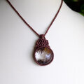 透明な水晶の中に、無数の針状のルチルが力強く迫力満点に入った魅力的なブラジル産レッドルチルクォーツのマクラメ編みペンダントです。ルチルクォーツの中でも人気の高いレッドルチルクォーツがには身に着けてると、愛情を深めるとも云われています。