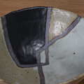焼き上がった白い部分はマット釉薬、黒い部分は黒釉薬、茶色い線は鉄サビ、全体のベージュ色は灰釉薬です。