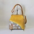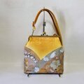 金色がかった辛子色に椿の柄が描かれた帯をリメイクしてがま口ショルダーバッグを作りました。