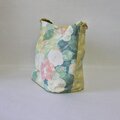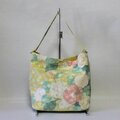 アップルグリーンに椿の花などが描かれた帯をリメイクしたバケツ型ショルダーバッグです。