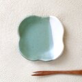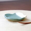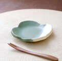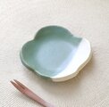 釉薬の色が冴える荒めの白陶土を可愛らしい四枚花弁のお花の形に成形して制作した豆皿です。
