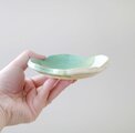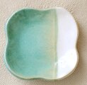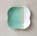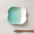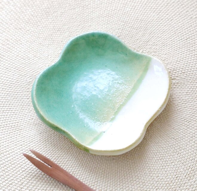 釉薬の色が冴える荒めの白陶土を可愛らしい四枚花弁のお花の形に成形して制作した豆皿です。