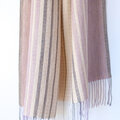 遠目ではシンプルなストライプ柄だけに見えますが、光の反射の仕方で小花柄がくっきりと浮き上がり、ナチュラルかつ華やかさもあるストールです。春や秋は広げてアウターの代わりに、夏は日差し避けや冷房対策に、冬は首元に小さく巻いて防寒対策に、纏い方によって一年中お楽しみいただけます。顔映りが良く優しい色合いで、シンプルで上品な大人コーデにお勧めです。