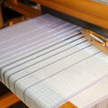 たて糸はふっくら柔らかいフレンチリネン糸を使い、ホワイトとラベンダーをメインカラーに、ネイビーブルーをアクセントカラーに、3色使いのストライプデザインにしています。よこ糸にはカシミヤとシルクが入った極細のリネン糸を2本どりで使い、エクリュ色の細やかな小花柄を全面に織り上げています。
