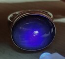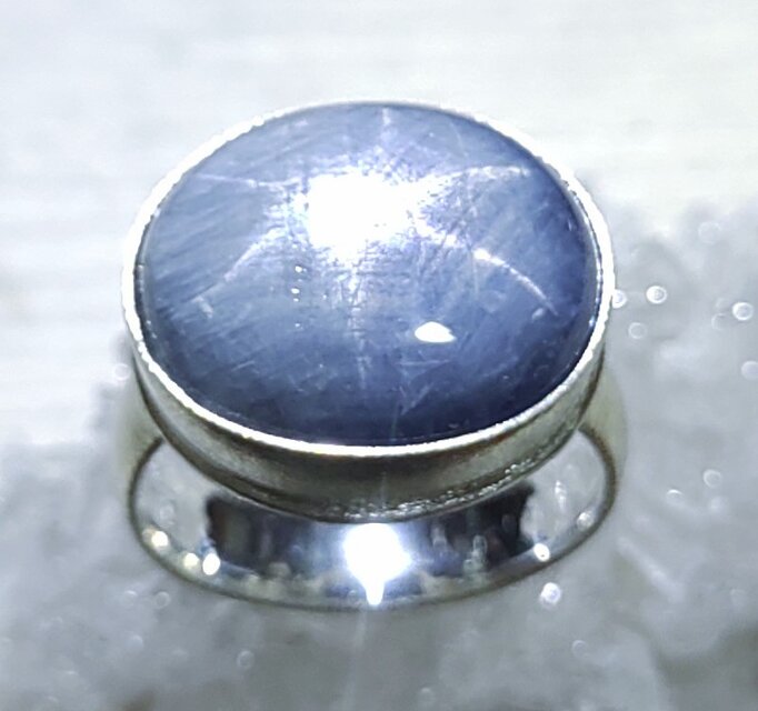 グレイッシュなブルーを背景にパッと浮かぶスターは妖精が現れるような雰囲気*直線が結ぶ六角形の模様が織物のような印象、ずっしりとした大粒スターサファイアのシルバーリングです*ブラックライト照射で極僅かな紫の蛍光反応(画像6枚目)が見られる迫力の29ctスターサファイアをお楽しみ下さい*リングはギラギラとした鋳肌のようなマット仕上げ、15~22号(推奨サイズ)の範囲を目安に調整可能、サイズ確定後にマットな覆輪で石留め致します*通常、黒化遅延処理を施しますが銀そのものの変化をお好みの場合は処理不要とお申し付けください*黒化防止ロジウム(最終画像下段色味参照)やK14·K18·K18lunapinkなど各種コーティングご希望の場合は承ります(オプション1000円)