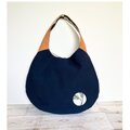 反対側はネイビーの綿麻に丸いモチーフを飾りました。持ち手は表は無地、裏はストライプです。