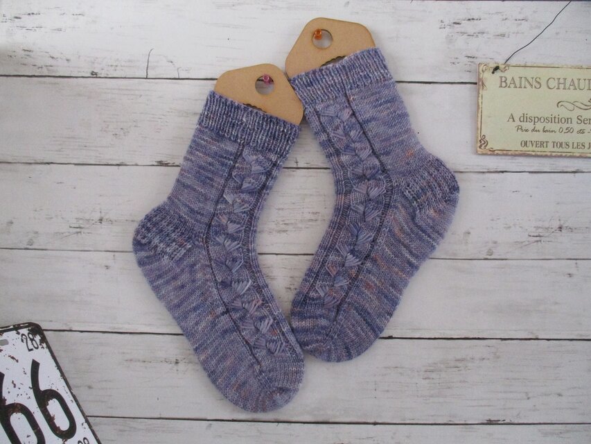 毛糸の特性上、左右で柄が違い靴下の両サイドに模様を編みました。