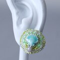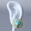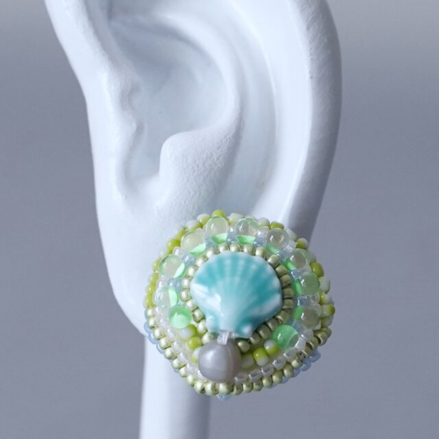おしゃべりなピアス 12 グリーン シェル カラフル おおぶり サージカルステンレスピアス 一点もの ビーズ刺繍