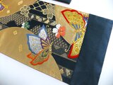 ■新品の帯をリメイクしました。紺地に桜、蝶が舞う華やかな文様です。色合いが鮮やかで高級感があります。