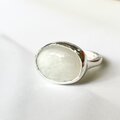 この指輪は、神秘的な光を放つホワイトムーンストーンを使用し、シンプルかつベゼルにツチメのアクセントをつけて仕上げました。