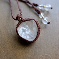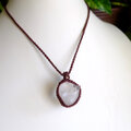 透明感のあり氷のようなナチュラルなままのロッククリスタル水晶ラフ原石のマクラメ編みペンダントネックレスです。