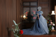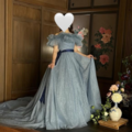実例写真!カラードレス ブルー オフショルダー チュールスカート ベルト キラキラチュール 前撮り