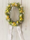 イモーテルをアクセントに、アジサイやかすみ草、ティーツリーなどをアレンジしたオーバル形のミニリース。