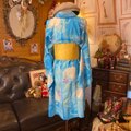 浴衣リメイク ミニミディ ワンピース ドレス 帯サッシュベルト 和洋折衷 空色の風に咲く、グラフィカル花 W-556