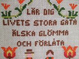 刺繍には「人生の偉大な謎を学び、愛し、忘れ、許しなさい」と記されています。