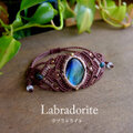 見る角度や光の加減で石全体にブルーグリーンに輝くシラー(ラブラドレッセンス)が美しい良質なマダガスカル産ラブラドライトとサイドにはアズライトを組み合わせた個性的なマクラメ編みブレスレットです。