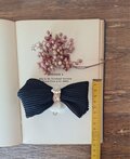 大きめのリボンの中央にラタンをあしらい、天然石やパール、ビーズを添えて、