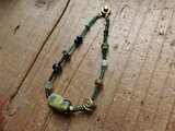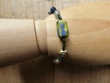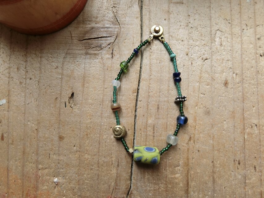 グリーンのラメと水色系の透過するビーズにいろいろなビーズ、古いものや現行品.ガラス.金属.ホーンビーズおそれぞれ等間隔で繋いでいます。落ち着きのある色のビーズを整列させた楽しいブレスです!