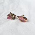 六角柱の原石をラフにカットした地球のかけらのようなトルマリンの爪留めピアス。ナチュラルなフォルムと夢見るようなメローなカラーが素敵です。ポストは14kgfを使ったオリジナル。ゴールドフィルドワイヤーをカドミウム・ニッケル不使用の14金ロウでロウ付けをし、一点一点手作業で包んでいます。
