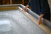 糸の掛け方には、ランダム、格子、斜線、市松柄など、様々なその糸の土台のデザインとなり、その糸パターンの上に和紙の原料のコウゾの繊維を漉きあげていきます。