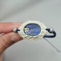 この作品に使用したルースには、深いコバルトブルーと紫がかった青の層に、柔らかな金色の煌めきが混じり、まるで夜明け前の空のような静けさを湛えています。