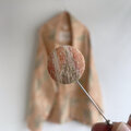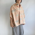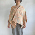 【1点もの】さんかく羽織 ブローチ付き -絹 着物地 紬 桃色に水色と緑の島の風景 (ヴィンテージ) TRH612