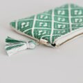 新色のグリーン×オフホワイトの組み合わせに、ゴールドの玉付きファスナーと2色のタッセルがふわふわ&ゆらゆらと可愛く、北欧風でナチュラルでポップなデザインのポーチに仕上がりました♪
