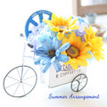 移動するお花屋さんの三輪車に、カゴいっぱいに夏のお花を乗せたアレンジメント