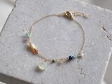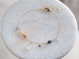 上品なオレンジカラーのマザーオブパールとグリーンカラーのプレナイトにカラフルな小粒の天然石は繊細さもありつつ力強く存在感を放ちます。