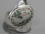 グリーンの濃淡、白、淡いピンク、翡翠の色ではレアですが、落ち着いた雰囲気と個性あるリングになりました。