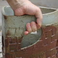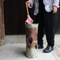 作った傘立てに灰釉薬を吹き付けて、焼き上げた傘立てです。