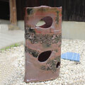 玄関の左右どちらでも置けれるように作ってあり、所々に葉っぱ形の穴を開けて、風とうしも良く、また、