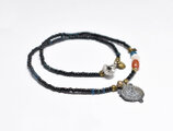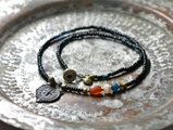 ヴィンテージインドメタルトップと漆黒&多彩ブルーシードビーズ、古代瑪瑙、シャン族カーネリアン、oldオリッサブラスを繋いだ華奢なネックレスです。