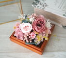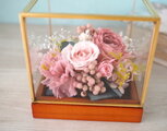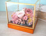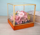 ガラスとアイアンゴールドのアンテークな器にプリザーブドフラワーのオールドローズやアジサイなどを使用した上品で可愛らしいフラワーアレンジメント。