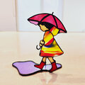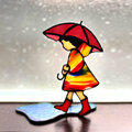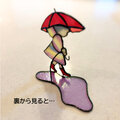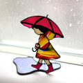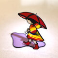 水たまりを歩いて、ぴしゃりと水が跳ねて…雨を楽しんでるようです。